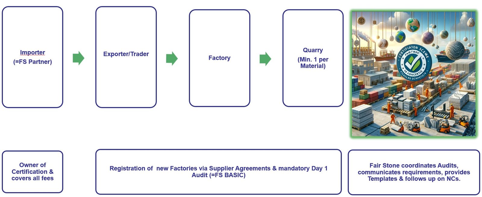 The Fair Stone Partners are responsible to implement the Fair Stone Standard in cooperation with their suppliers. The Fair Stone Team supervises this process, coordinates audits and control vists and the local representative supports the implementation